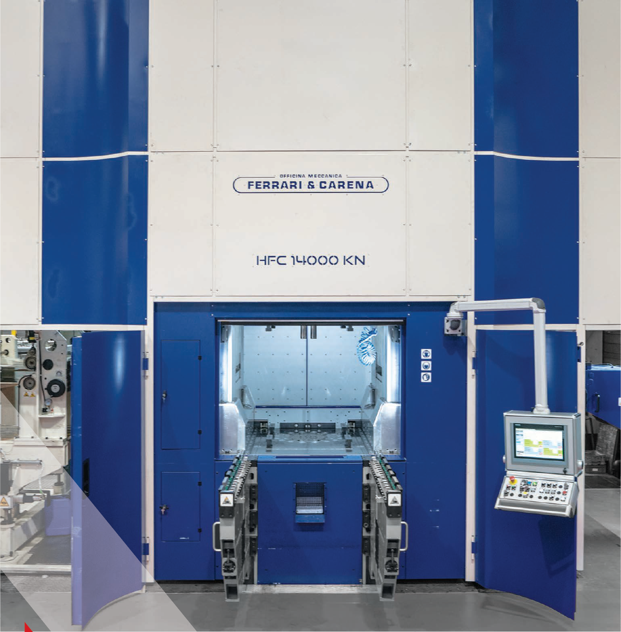 The Ferrari & Carena HFC 8000 kN is a high-capacity fine-blanking press engineered for precision and durability. It features a frame 30% more robust than industry standards and a patented safety system that secures the work area during power failures.